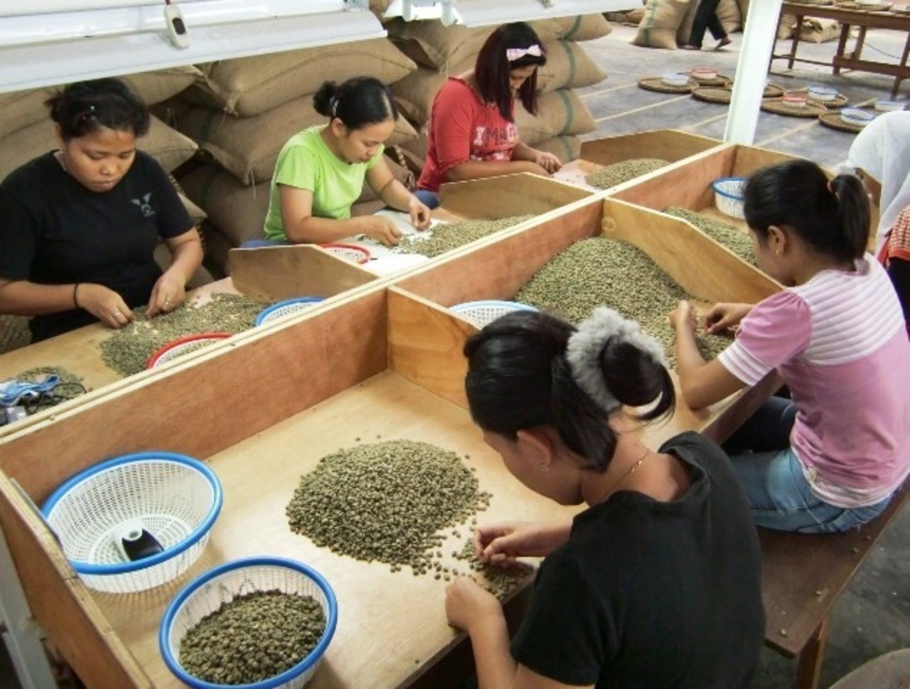 まだ豆が柔らかい状態で脱穀を行うため、一般的にマンデリンは生豆の先が裂けてしまうことがどうしても起こります。品質やアピアランスを向上させるため、生産者さん達は生豆をハンドピックし、品質劣化の可能性のある豆を一粒ずつ丁寧に取り除いていくのです。
